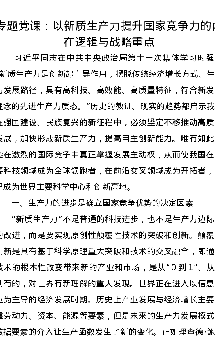 党课讲稿:以新质生产力提升国家竞争力的内在逻辑与战略重点
