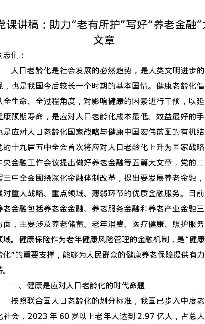 党课讲稿:助力“老有所护”写好“养老金融”大文章