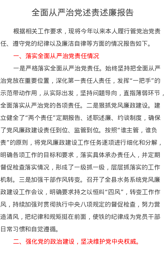xx水务局党组书记全面从严治党述责述廉报告