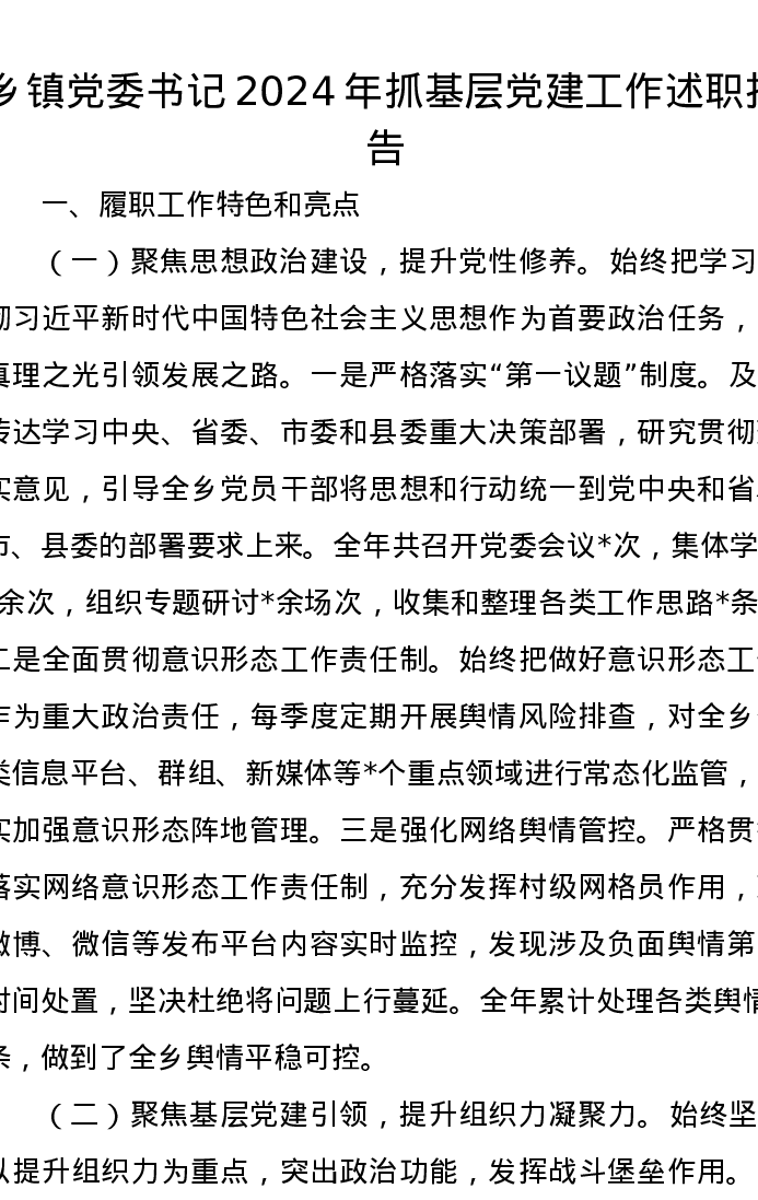 乡镇党委书记2024年抓基层党建工作述职报告