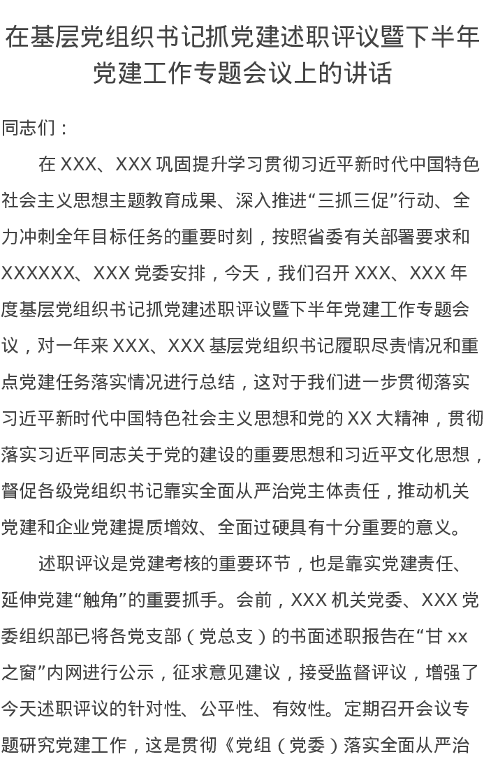 在基层党组织书记抓党建述职评议暨下半年党建工作专题会议上的讲话