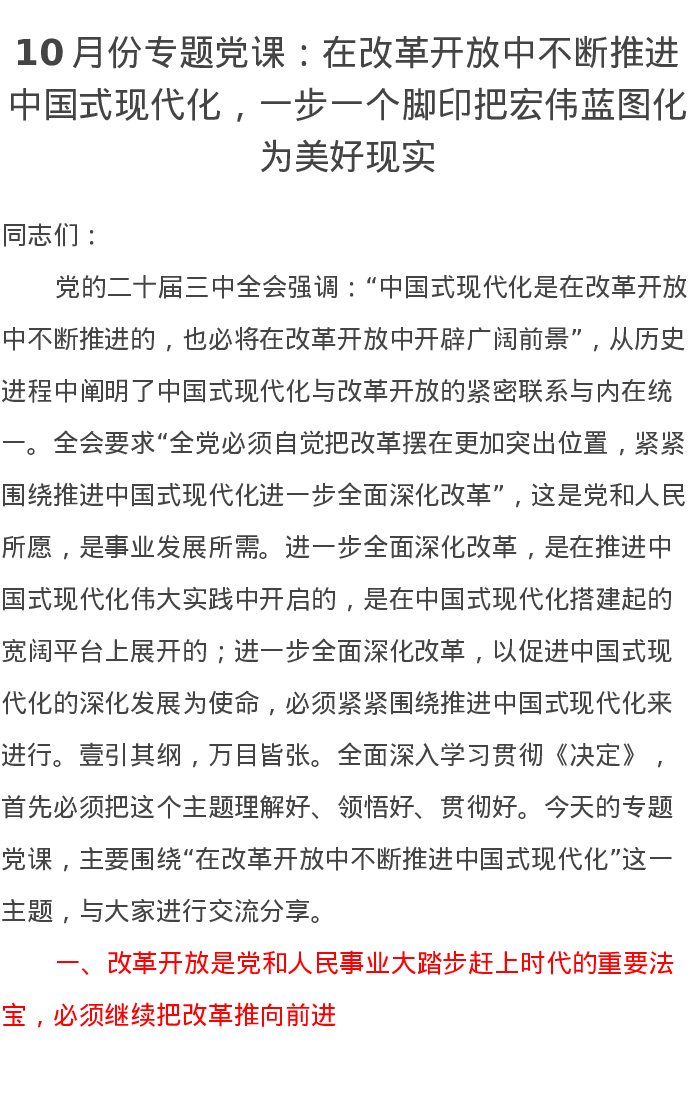 10月份党课讲稿:在改革开放中不断推进中国式现代化,一步一个脚印把宏伟蓝图化为美好现实
