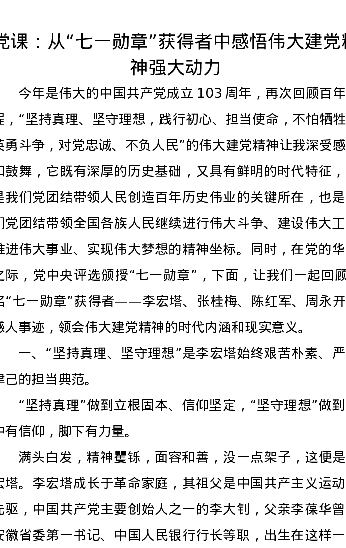 党课讲稿:从“七一勋章”获得者中感悟伟大建党精神强大动力