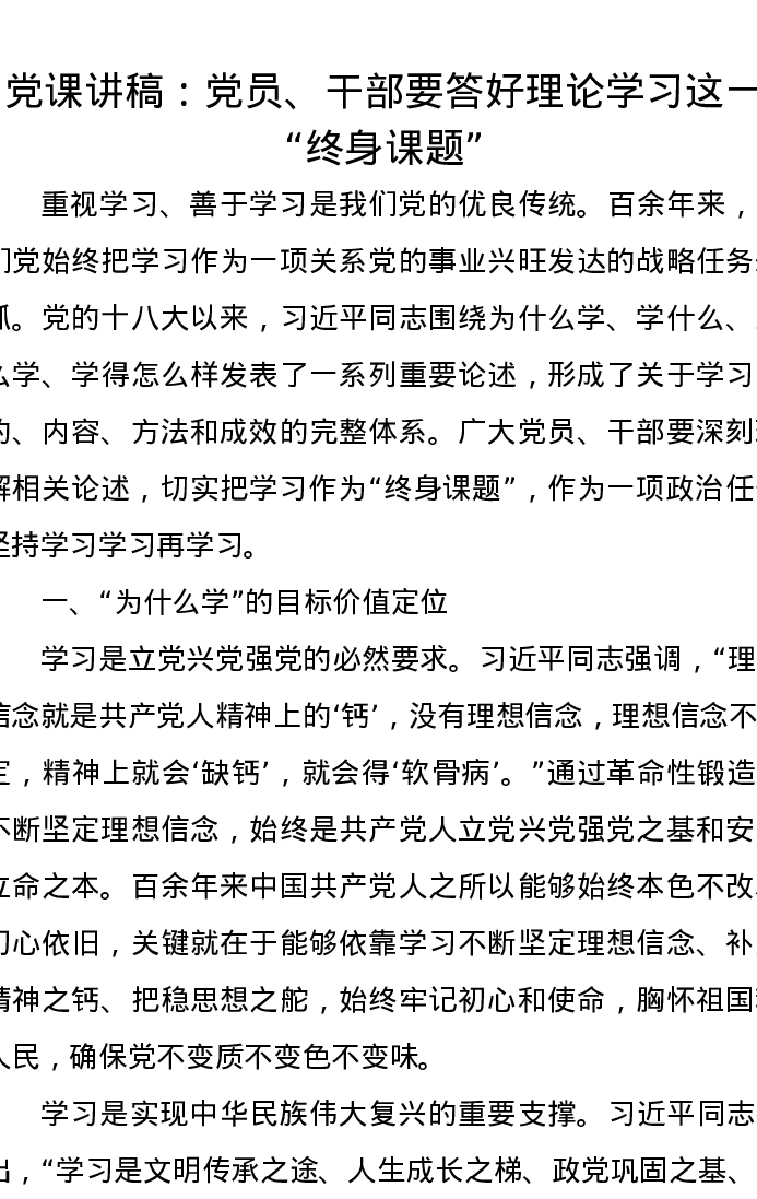 党课讲稿:党员、干部要答好理论学习这一“终身课题”