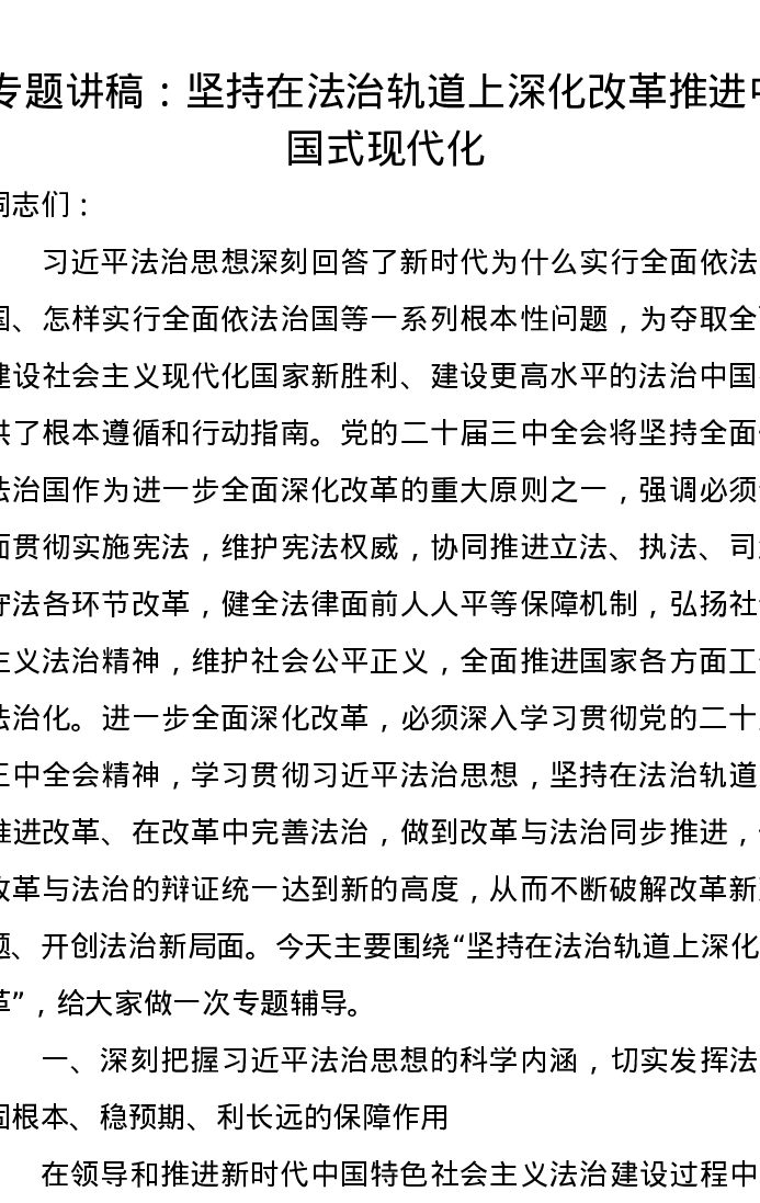 党课讲稿:坚持在法治轨道上深化改革推进中国式现代化