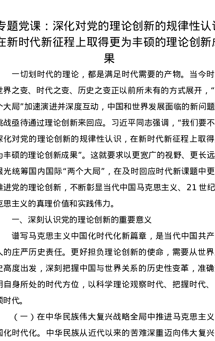 党课讲稿:深化对党的理论创新的规律性认识,在新时代新征程上取得更为丰硕的理论创新成果