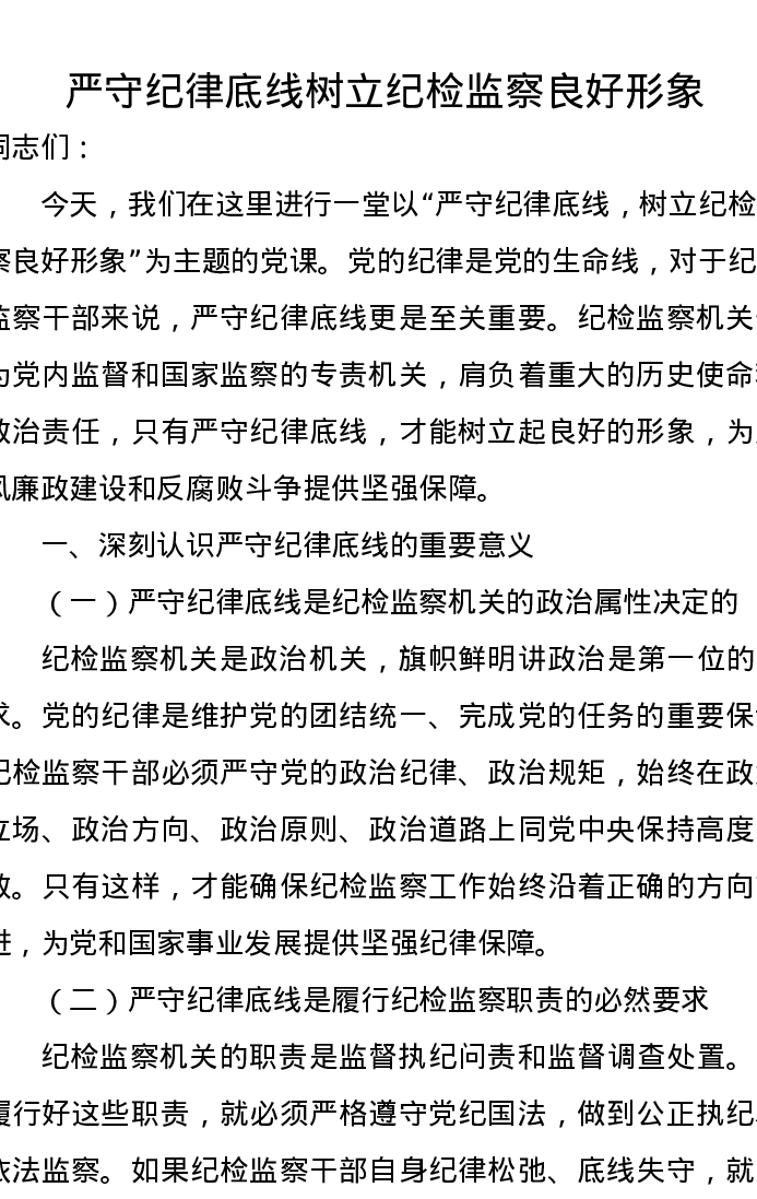 党课讲稿:严守纪律底线树立纪检监察良好形象