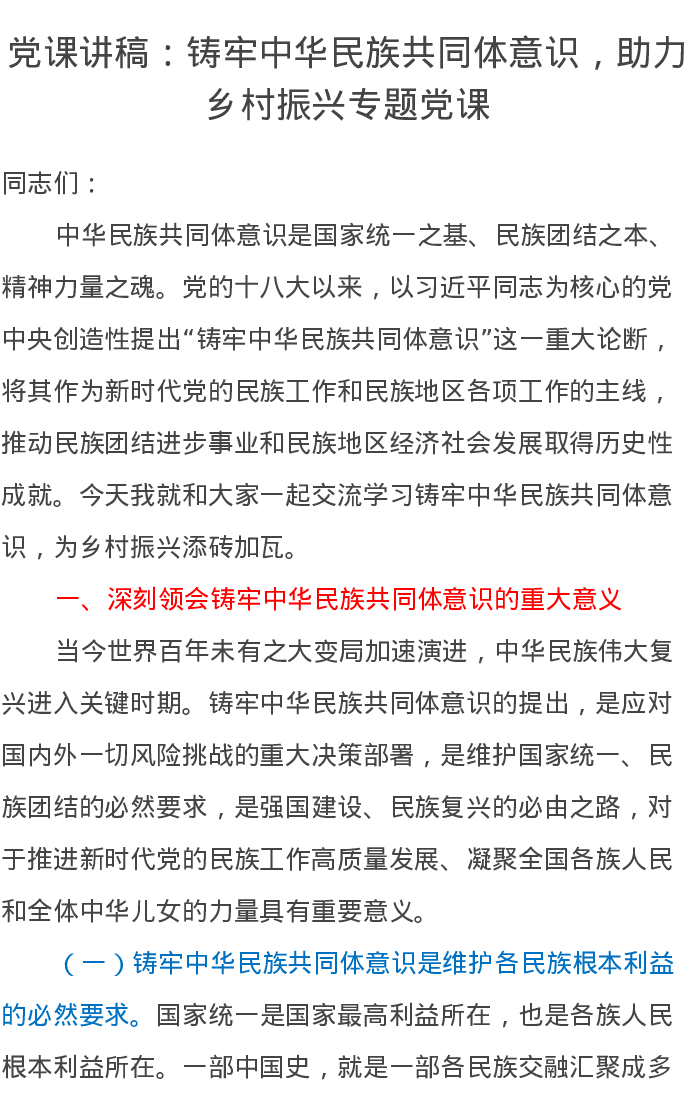 党课讲稿:铸牢中华民族共同体意识,助力乡村振兴专题党课