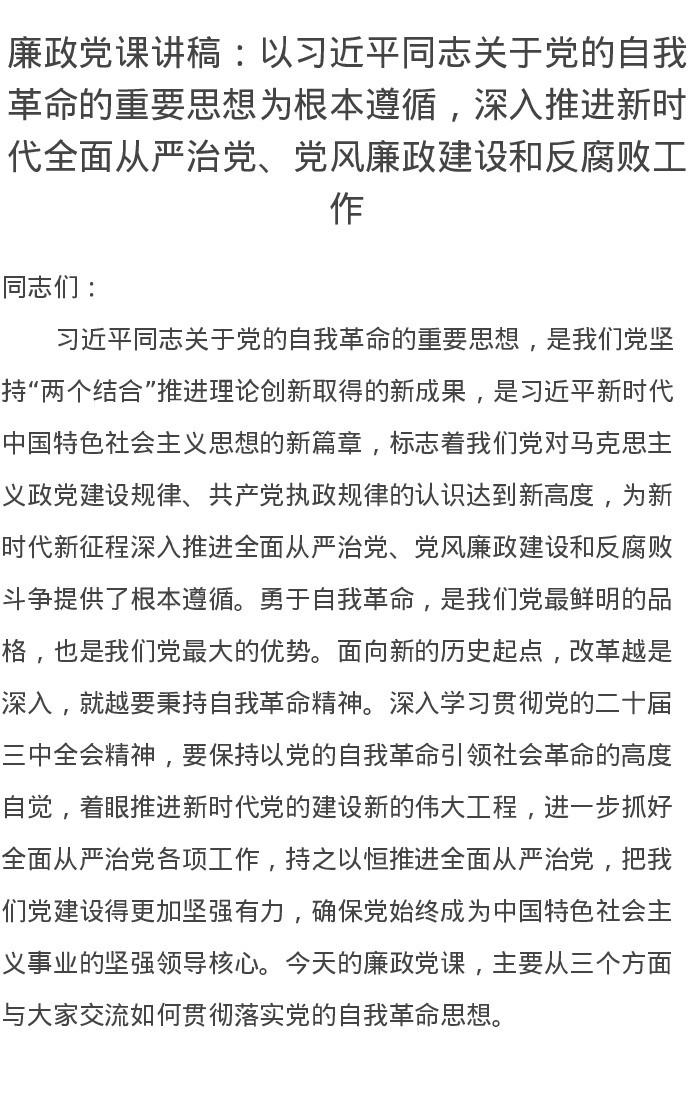 廉政党课讲稿:以习近平同志关于党的自我革命的重要思想为根本遵循,深入推进新时代全面从严治党、党风廉政建设和反腐败工作