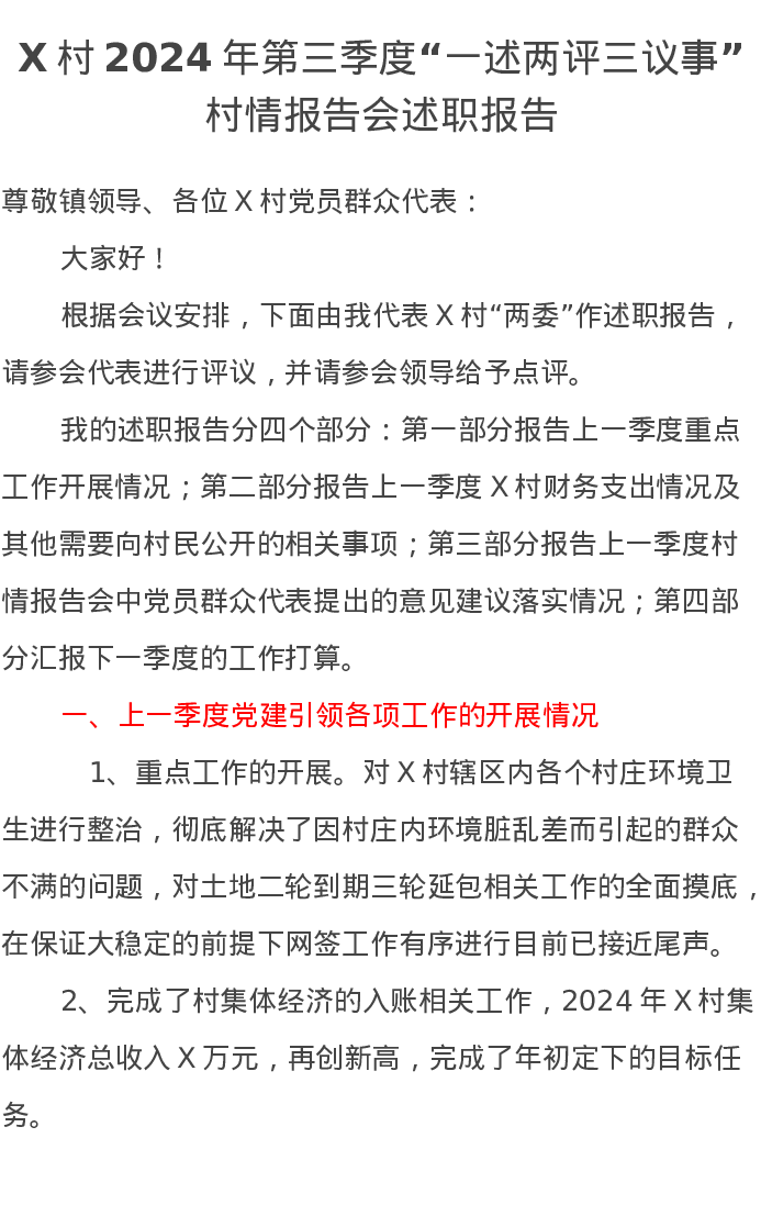 X村2024年第三季度“一述两评三议事”村情报告会述职报告