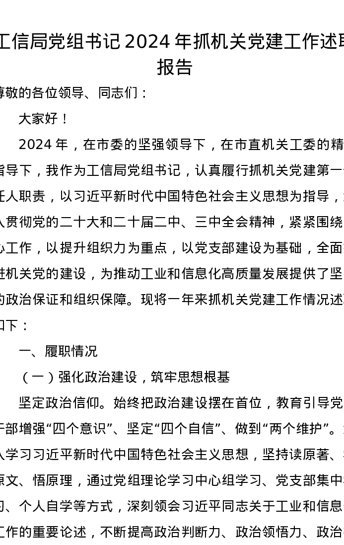 工信局党组书记 2024 年抓机关党建工作述职报告