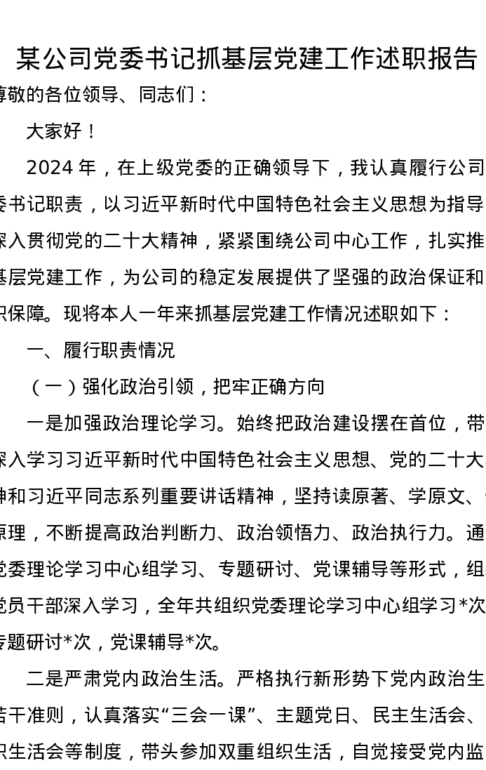 某公司党委书记抓基层党建工作述职报告