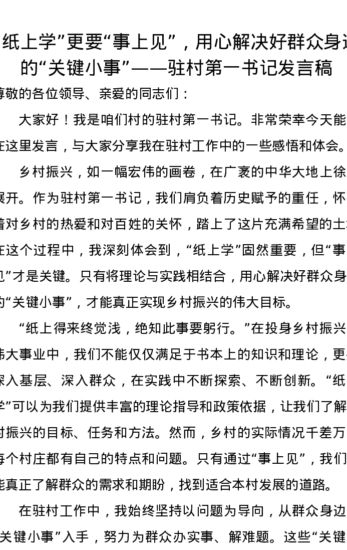 “纸上学” 更要 “事上见”,用心解决好群众身边的 “关键小事”——驻村第一书记发言稿