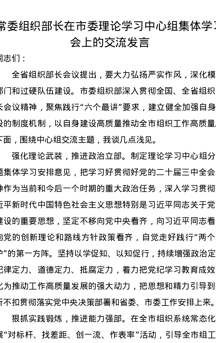常委组织部长在市委理论学习中心组集体学习会上的交流发言
