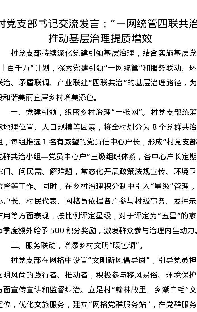 村党支部书记交流发言:“一网统管 四联共治”推动基层治理提质增效