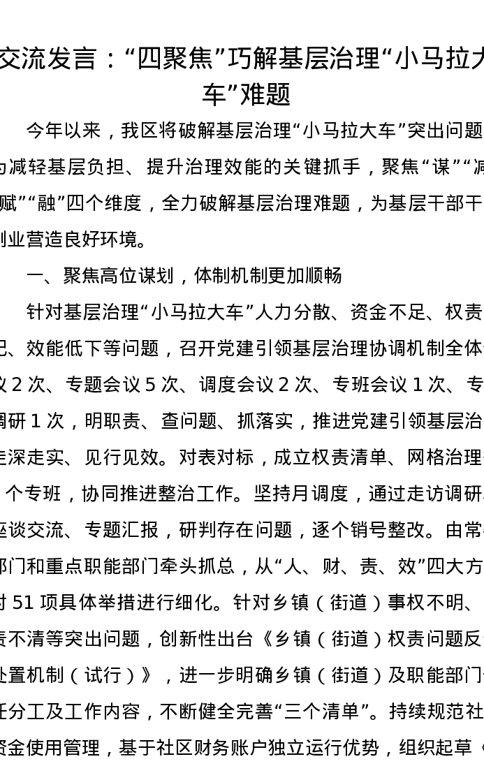 交流发言:“四聚焦”巧解基层治理“小马拉大车”难题