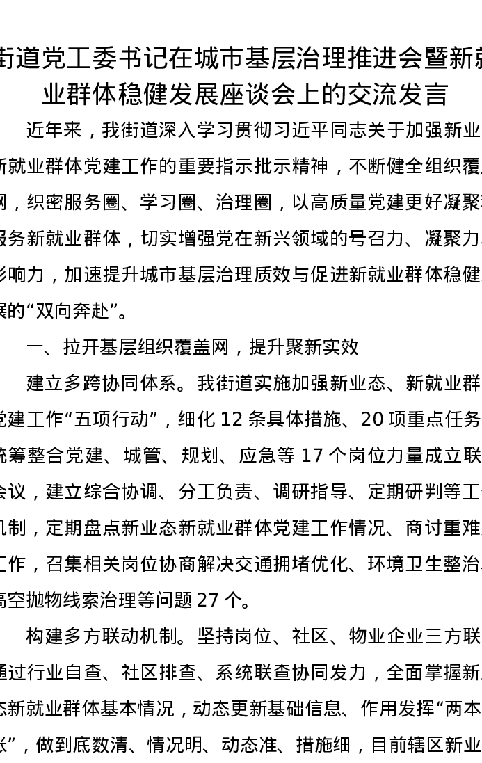街道党工委书记在城市基层治理推进会暨新就业群体稳健发展座谈会上的交流发言