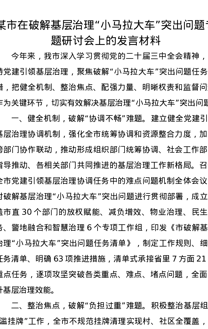 某市在破解基层治理“小马拉大车”突出问题专题研讨会上的发言材料