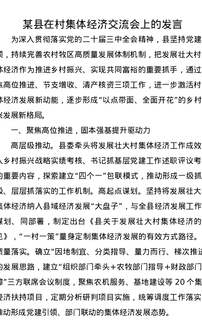 某县在村集体经济交流会上的发言