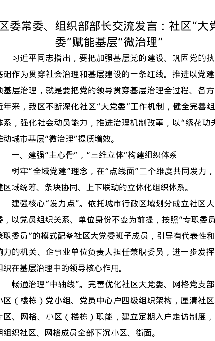 区委常委、组织部部长交流发言:社区“大党委”赋能基层“微治理”