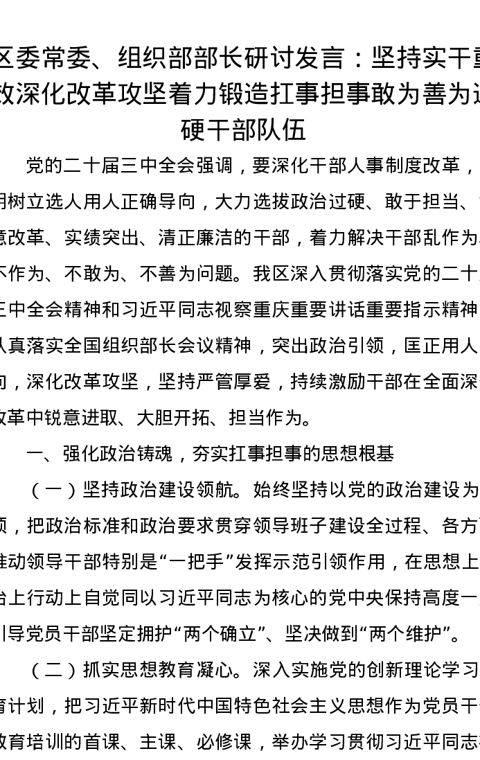 区委常委、组织部部长研讨发言:坚持实干重效深化改革攻坚着力锻造扛事担事敢为善为过硬干部队伍