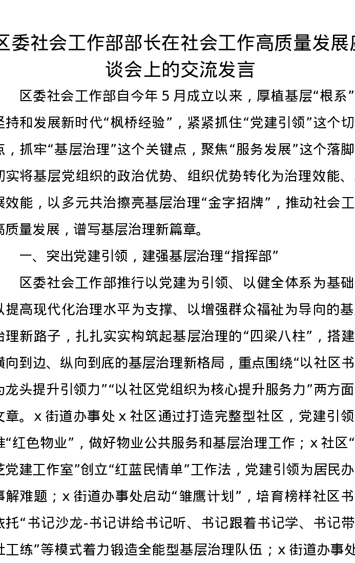 区委社会工作部部长在社会工作高质量发展座谈会上的交流发言
