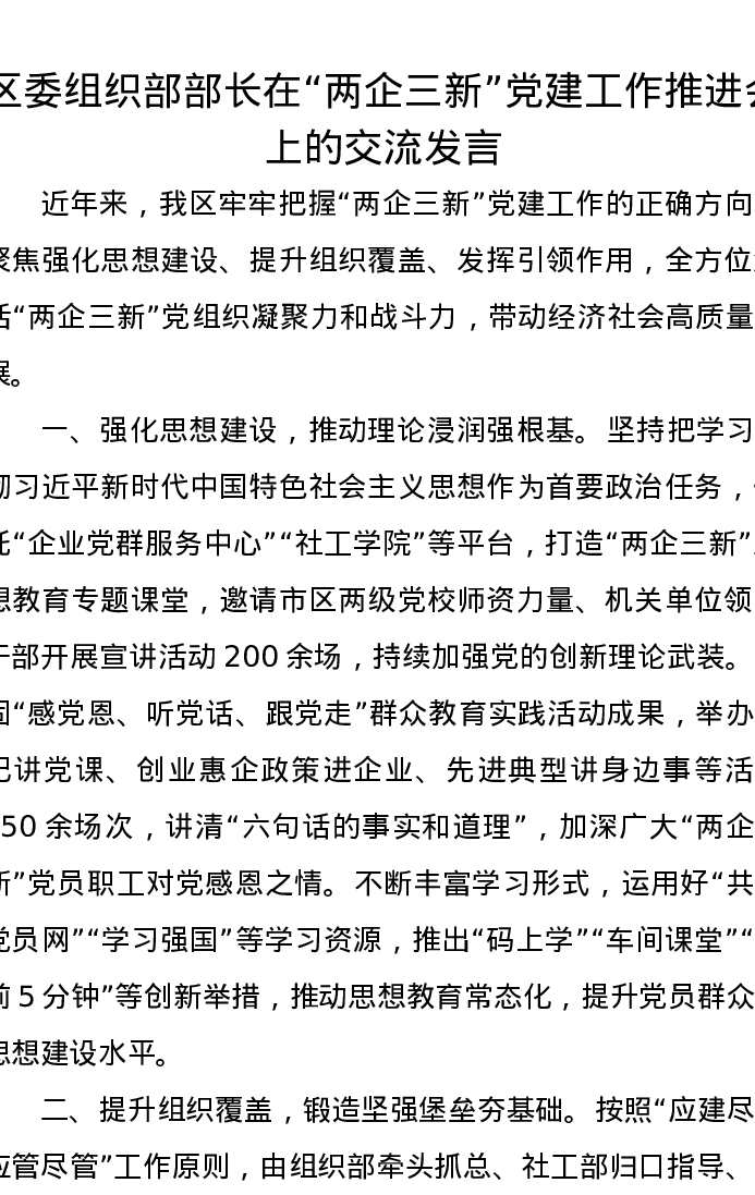 区委组织部部长在“两企三新”党建工作推进会上的交流发言