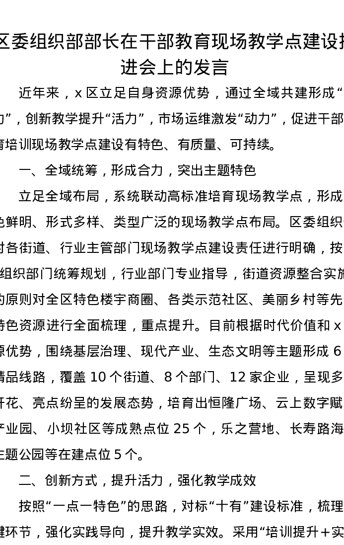 区委组织部部长在干部教育现场教学点建设推进会上的发言