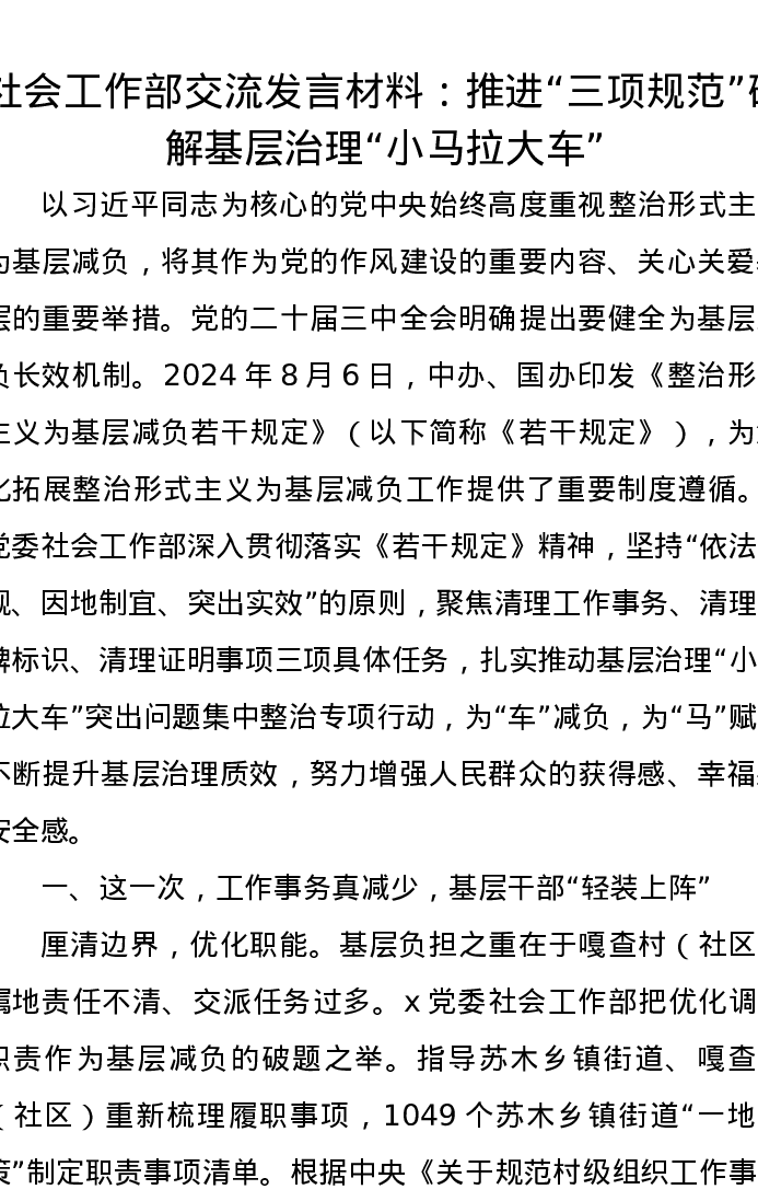社会工作部交流发言材料:推进“三项规范”破解基层治理“小马拉大车”