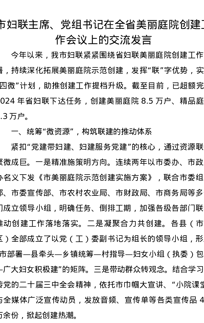 市妇联主席、党组书记在全省美丽庭院创建工作会议上的交流发言