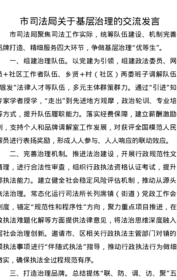 市司法局关于基层治理的交流发言