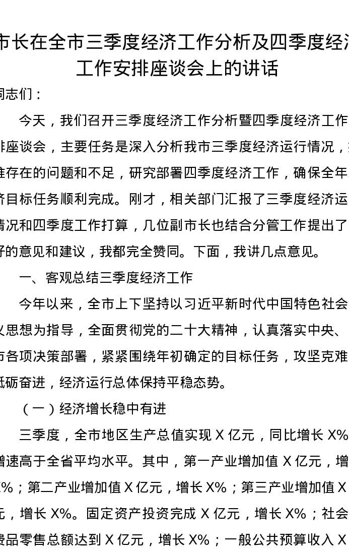 市长在全市三季度经济工作分析及四季度经济工作安排座谈会上的讲话