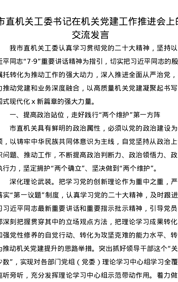 市直机关工委书记在机关党建工作推进会上的交流发言