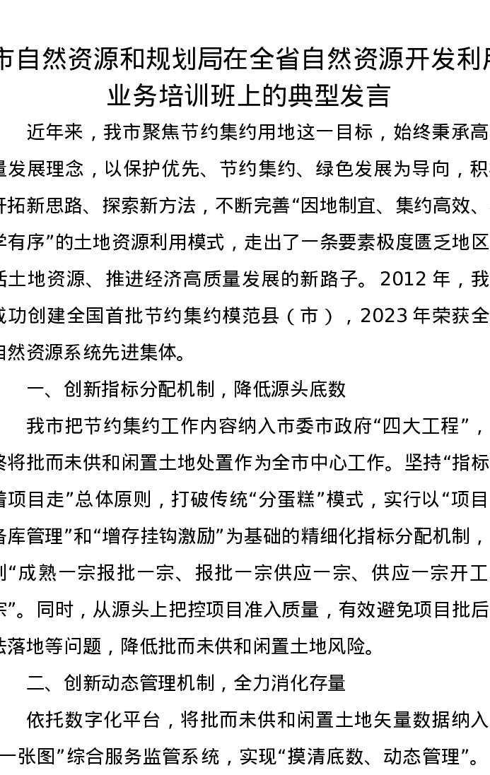 市自然资源和规划局在全省自然资源开发利用业务培训班上的典型发言