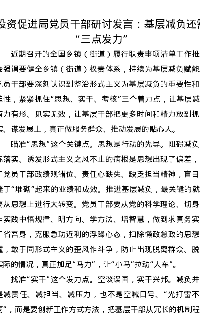 投资促进局党员干部研讨发言:基层减负还需“三点发力”