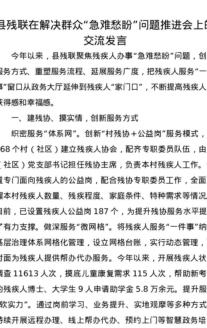 县残联在解决群众“急难愁盼”问题推进会上的交流发言