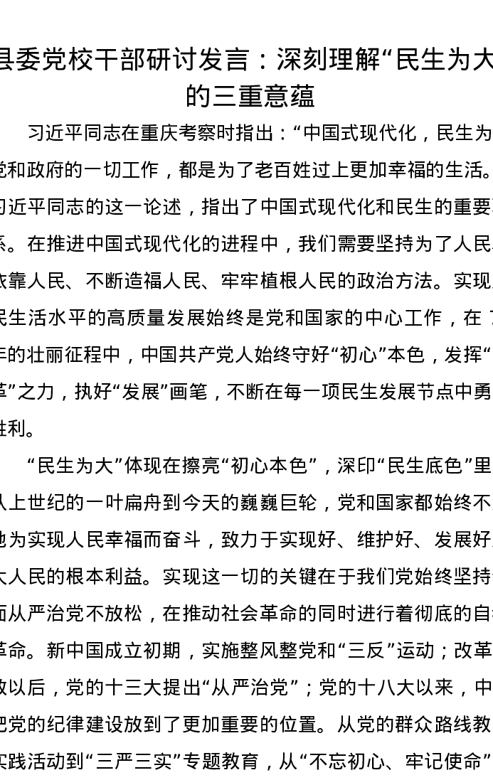 县委党校干部研讨发言:深刻理解“民生为大”的三重意蕴
