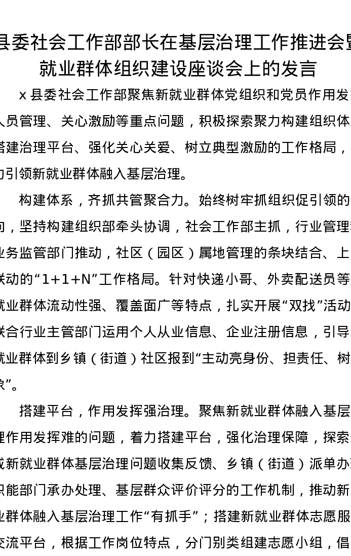 县委社会工作部部长在基层治理工作推进会暨就业群体组织建设座谈会上的发言
