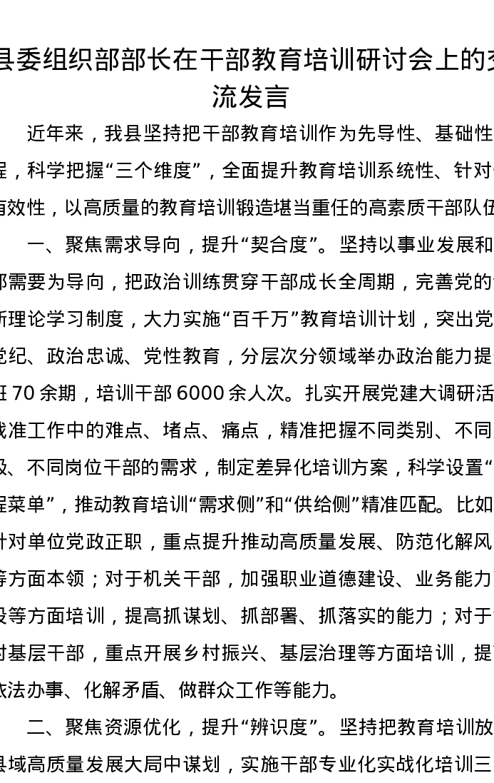 县委组织部部长在干部教育培训研讨会上的交流发言