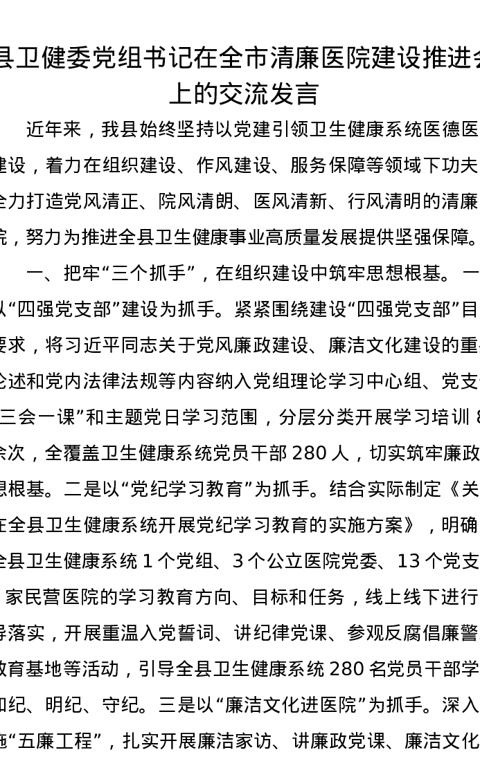 县卫健委党组书记在全市清廉医院建设推进会上的交流发言