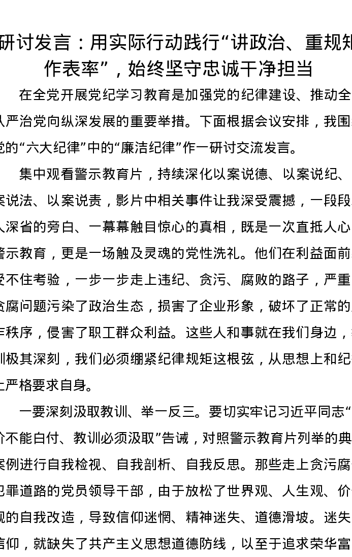 研讨发言:用实际行动践行“讲政治、重规矩、作表率”,始终坚守忠诚干净担当