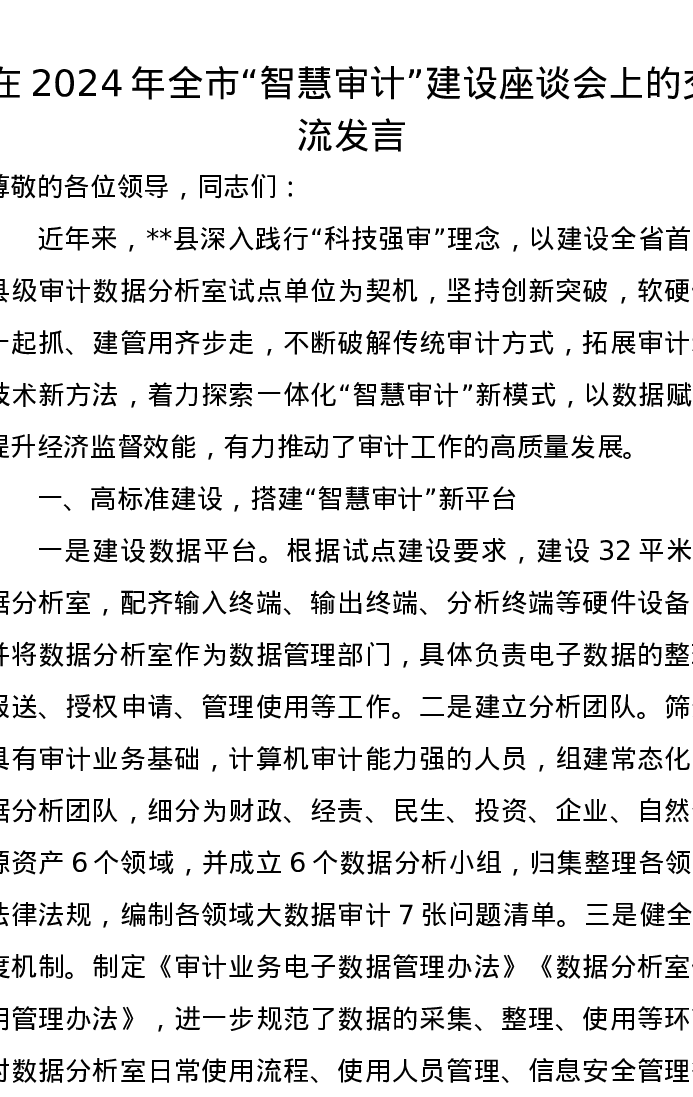 在2024年全市“智慧审计”建设座谈会上的交流发言