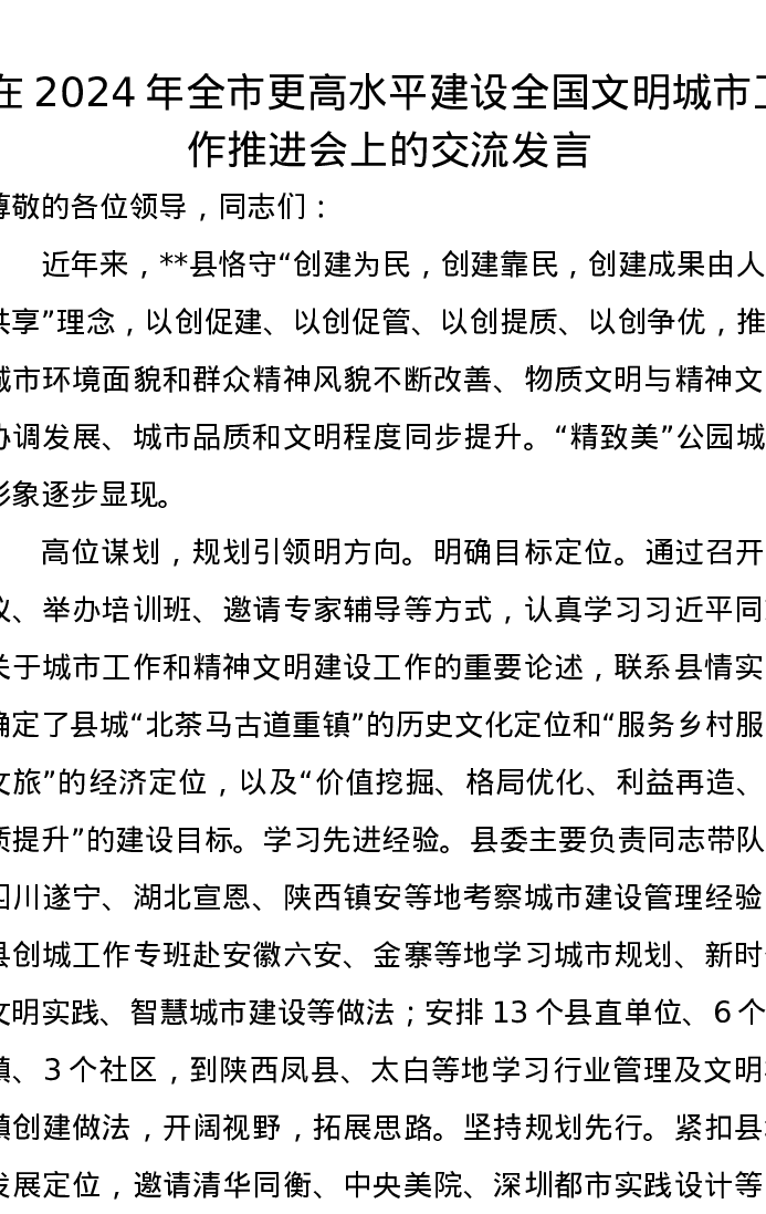 在2024年全市更高水平建设全国文明城市工作推进会上的交流发言