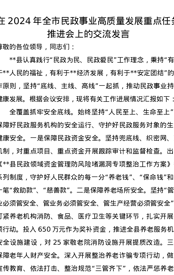 在2024年全市民政事业高质量发展重点任务推进会上的交流发言