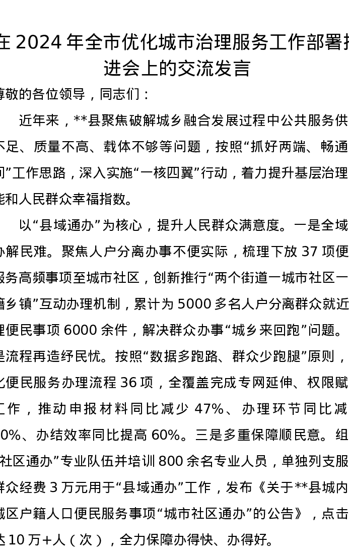 在2024年全市优化城市治理服务工作部署推进会上的交流发言