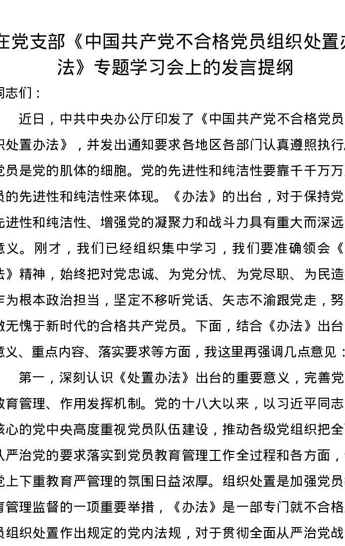 在党支部《中国共产党不合格党员组织处置办法》专题学习会上的发言提纲