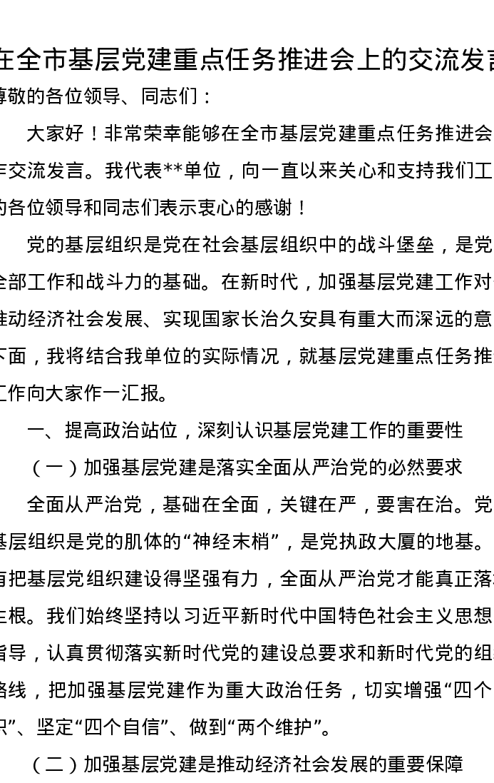 在全市基层党建重点任务推进会上的交流发言