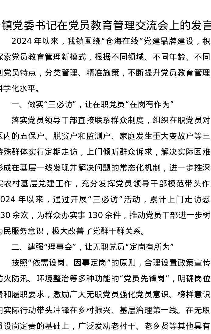 镇党委书记在党员教育管理交流会上的发言
