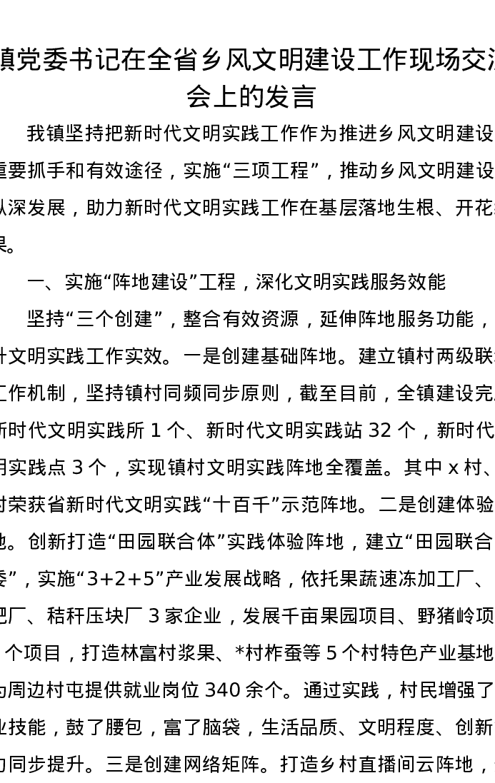 镇党委书记在全省乡风文明建设工作现场交流会上的发言