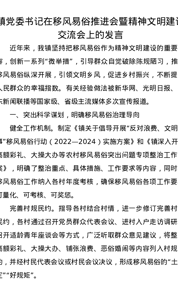 镇党委书记在移风易俗推进会暨精神文明建设交流会上的发言
